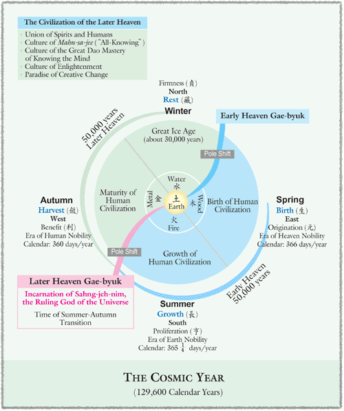 Each Cosmic Year spans 129,600 years and consists of four cosmic seasons—cosmic spring, summer, autumn, and winter. The first two seasons, spring and summer, together form the era of the Early Heaven, while autumn and winter constitute the Later Heaven.
